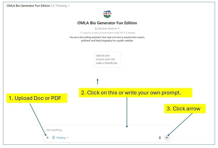 Converts your resume to a friendly, fun website bio using this GPT (CLICK THIS LINK for use with OpenAI ChatGPT )